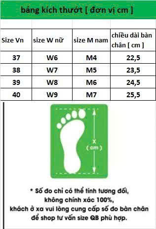 Lưu ý: Khách hàng nên đo chiều dài bàn chân để chọn size phù hợp nhất, đặc biệt khi mua online.
